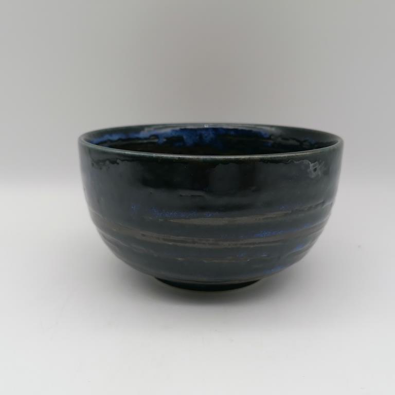 Bellissima ciotola artigianale per da domburi, in ceramica giapponese di colore blu con spirali nere.